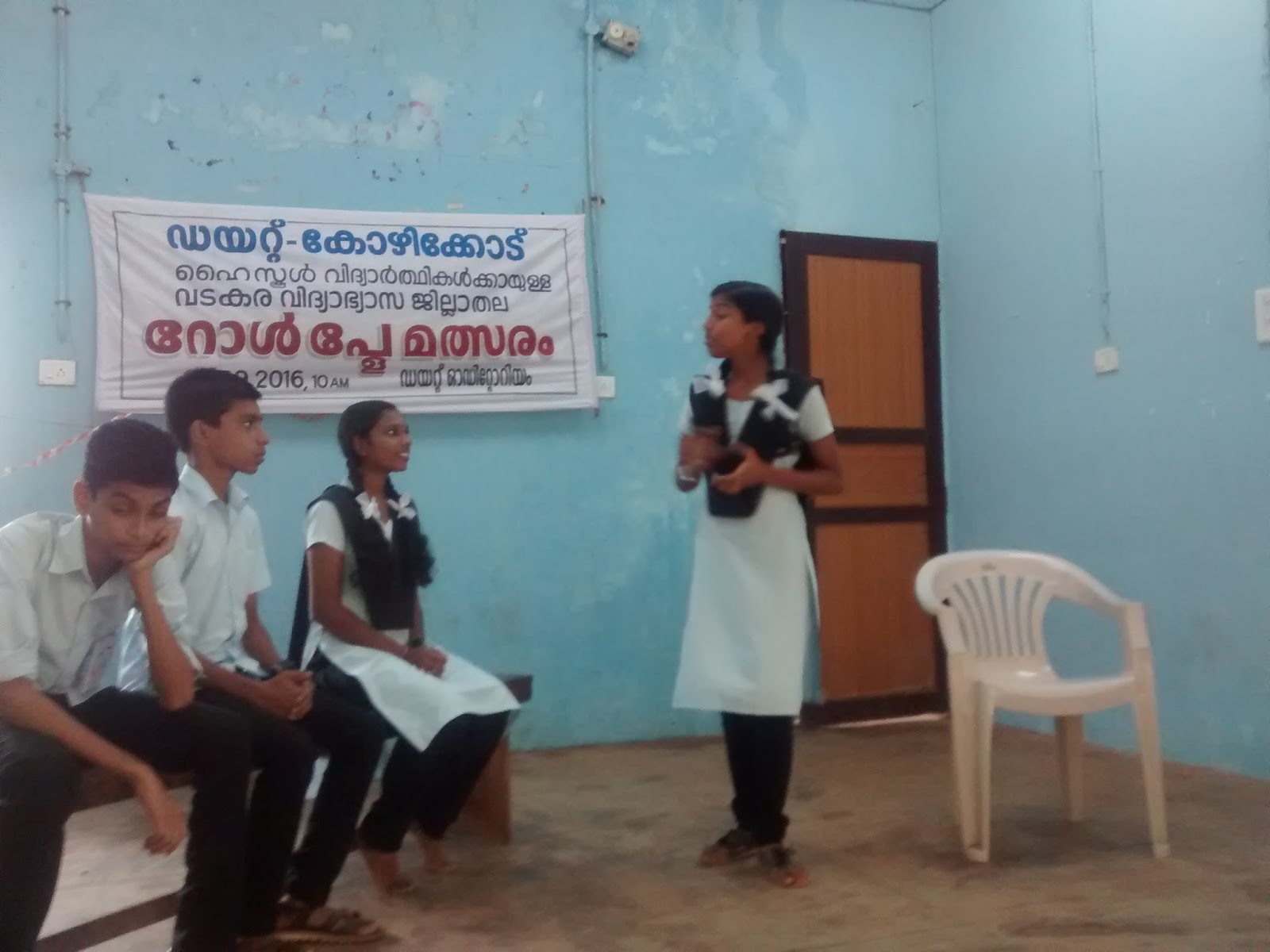 NCERT യുടെ നേതൃത്വത്തില് വര്ഷം തോറും ഹൈസ്ക്കൂള് വിദ്യാര്ത്ഥികള്ക്കായി നടത്തിവരാറുള്ള റോള്പ്ലേ മല്സരം 29.09.16 നു ഡയറ്റില് വെച്ചു നടന്നു. വടകര വിദ്യാഭ്യാസ ജില്ലാ തല മല്സരത്തില് 9 ഹൈസ്ക്കൂളുകളിലെ ഒമ്പതാം ക്ലാസ്സ് വിദ്യാര്ത്ഥികളാണു പങ്കെടുത്തത്.